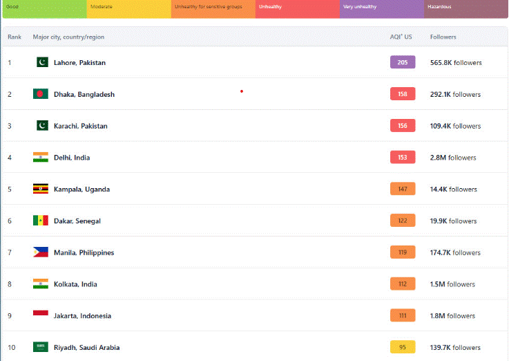 বায়ু দূষণের এ তালিকায় ২০৫ স্কোর নিয়ে প্রথম স্থানে রয়েছে পাকিস্তানের লাহোর। তৃতীয় স্থানে রয়েছে পাকিস্তানের আরেক শহর করাচি, যার স্কোর ২৪৮। ১৫৩ স্কোর নিয়ে চতুর্থ স্থানে রয়েছে ভারতের দিল্লি শহর। পঞ্চম স্থানে রয়েছে উগান্ডার কামপালা, যার স্কোর ১৪৭।